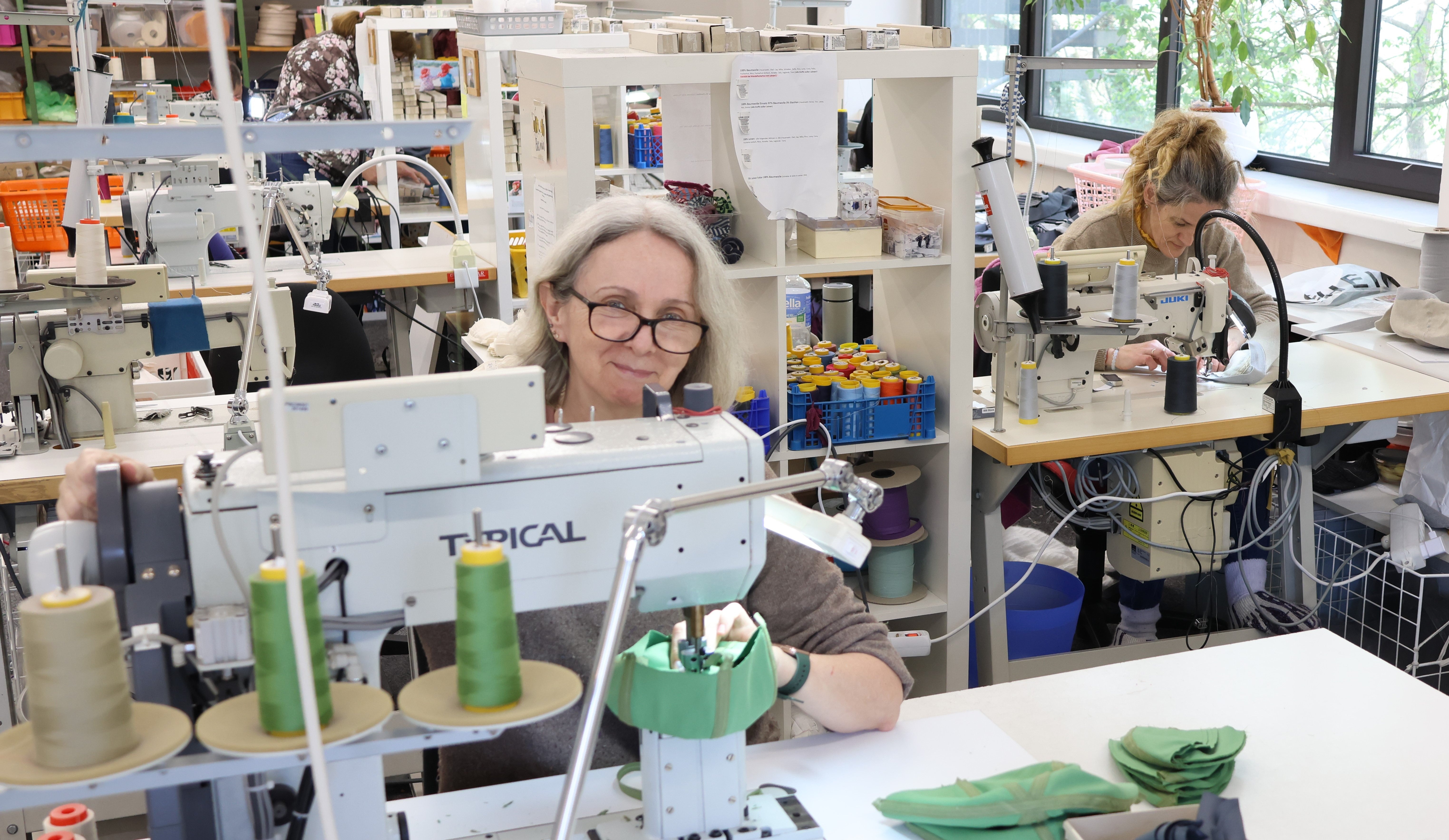 Im Zuschnitt kümmern sich Evgeni, Ani und Yasin um den nächsten Arbeitsschritt. Anhand von Zuschnittplänen schneiden sie aus den verschiedensten ökologischen Stoffen die Teile, die später einmal zu Mützen, Schals, Puschen, Fäusteln und den vielen anderen Artikeln aus unseren Sortiment zusammengefügt werden.